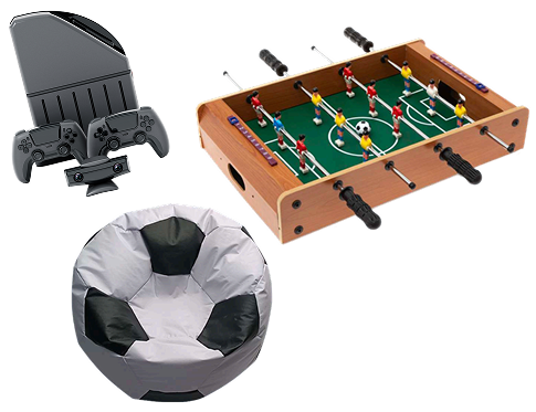 Para armar tu kit juegazo incluye consola, mesa de futbolito y 2 puffs tipo balón de soccer
